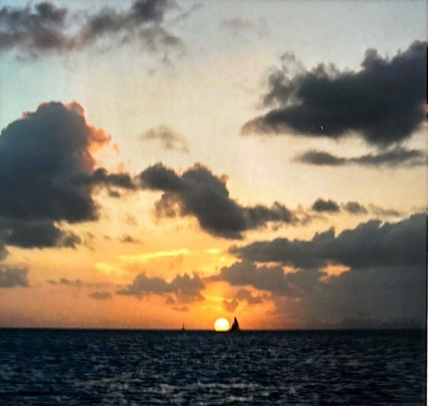 Both women turned in their seats to look at the colorful western sky now streaked with violet and deep pink. The sun floated on the edge of the ocean for a dramatic moment and then disappeared.